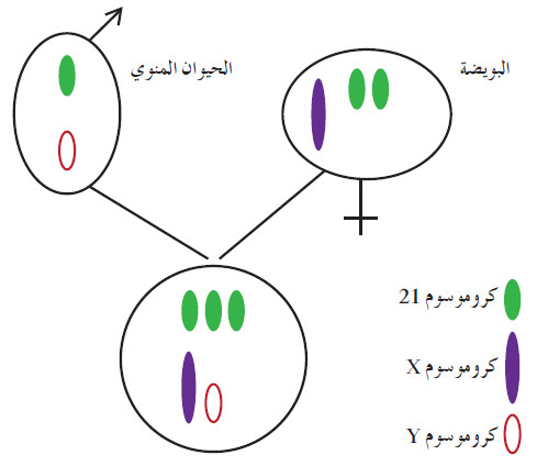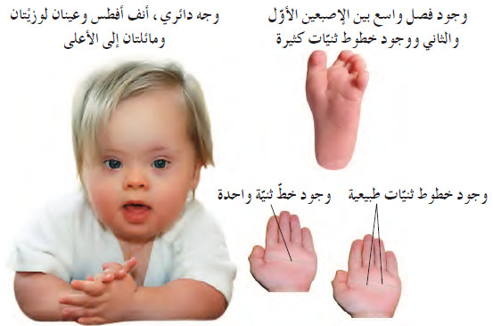 إذ توجد نسخة إضافية من كروموسوم 21 لدى الطفل، فيُولد لديه تشوّها كروموسوميا يُسمى متلازمة داون Down Syndrom ، التي تظهر عوارضها في صورة الطفل المبين في الشكل التالي:
